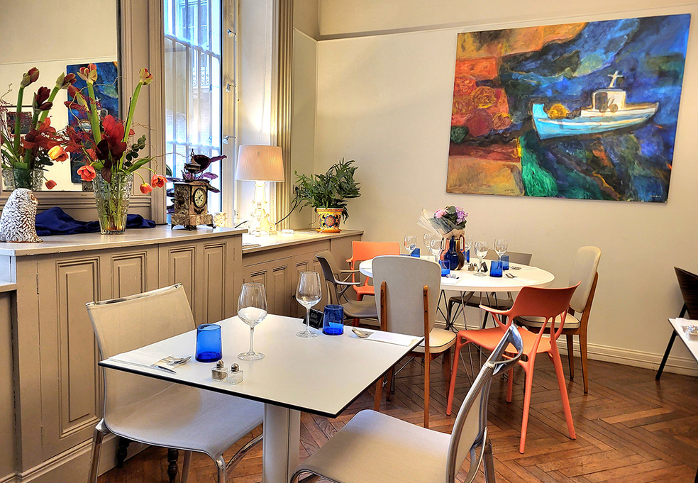 Quant à la décoration, elle se veut originale, mêlant vintage et design moderne, dans une ambiance à la fois chic et conviviale « sur les murs des gravures originales des fameux peintres grecs Fassianos et Gaïtis, ainsi que mes peintures, il faut savoir que restaurant était une galerie d’art » commente-t-elle.